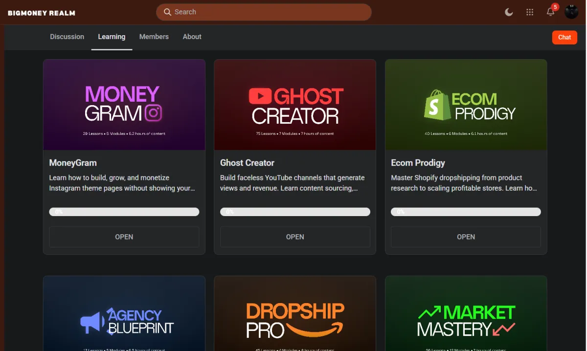 BigMoneyRealm gives you instant access to multiple online business programs designed to help you start and scale digital income streams.